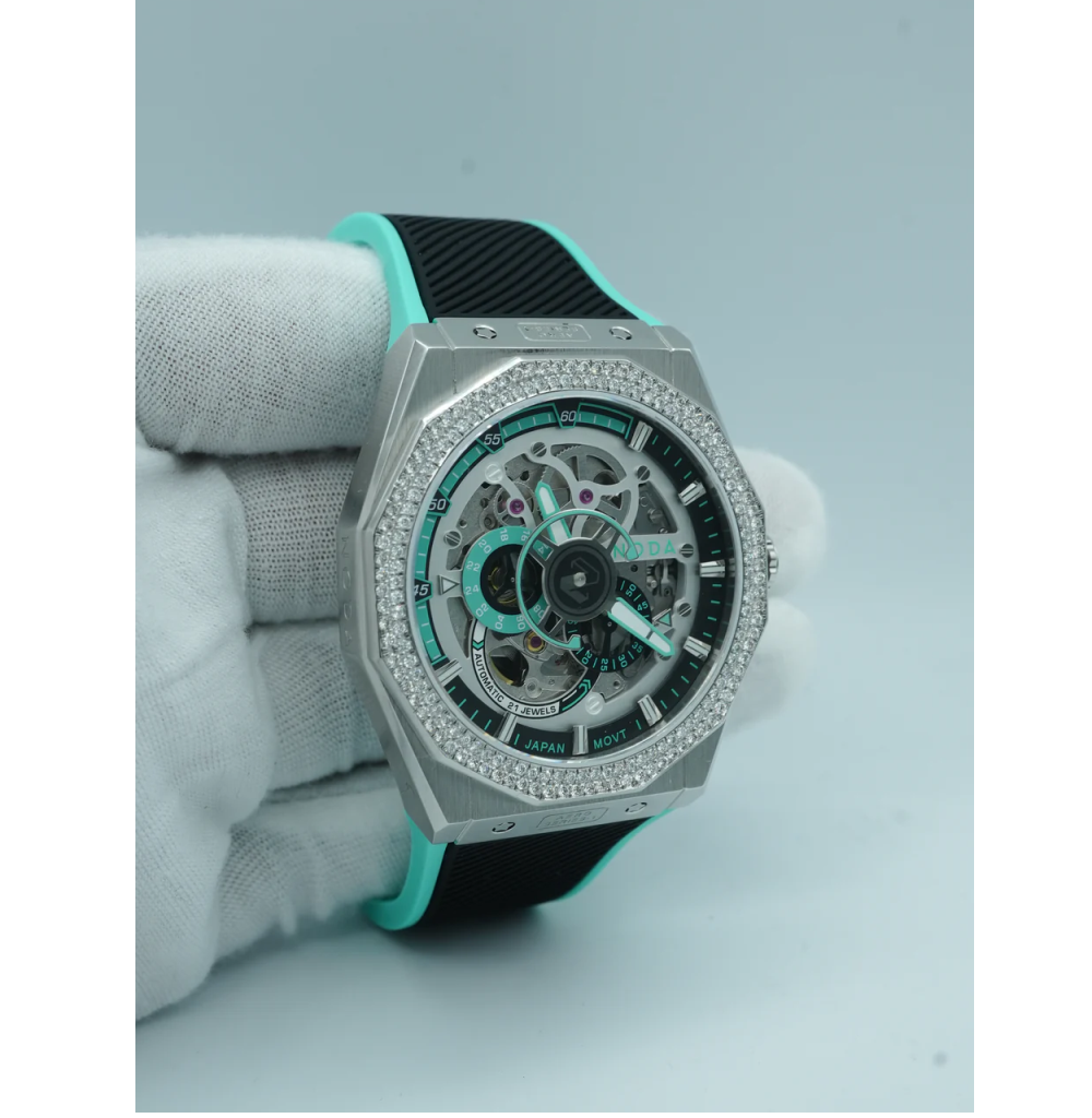 The Noda Aero Series1 43mm Steel Skeleton watch combines refined elegance with intricate craftsmanship. Featuring a striking Tiffany Blue diamond dial, this automatic timepiece crafted in Japan offers a captivating glimpse of its precision movement. Its stainless steel case ensures durability while maintaining a sophisticated profile, making it an exceptional accessory for the discerning gentleman.