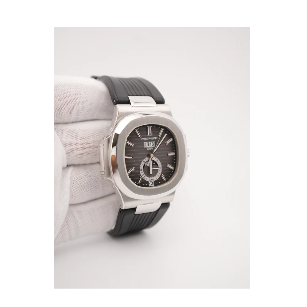 The Patek Philippe 5726A-001 Nautilus features a distinctive black index dial paired with a durable rubber strap, offering a sleek yet sporty aesthetic. This 2012 complete set includes the annual calendar and moon phase complications, exemplifying Patek Philippe's mastery in horology. Its stainless steel case ensures robustness while maintaining a refined profile suitable for both formal and casual occasions. Ideal for collectors and connoisseurs seeking a sophisticated timepiece that balances technical excellence with everyday wearability.
