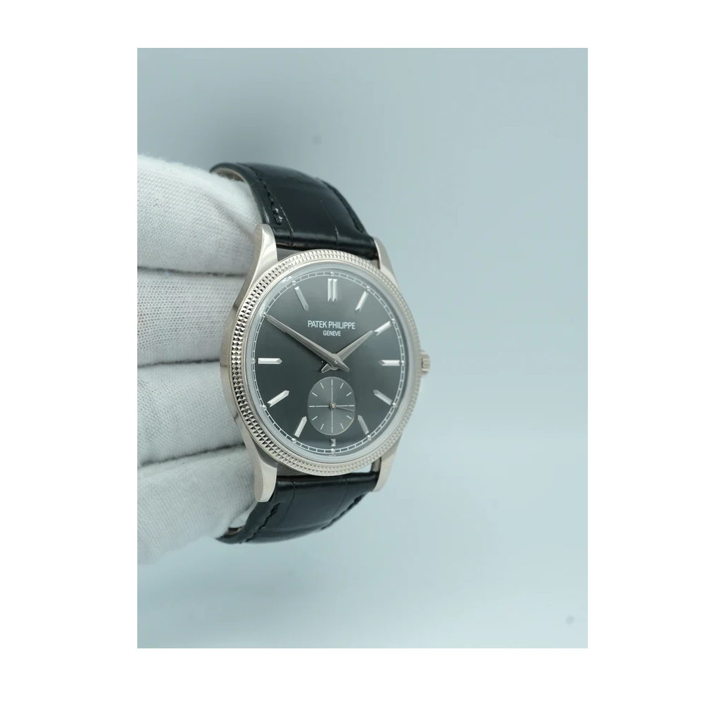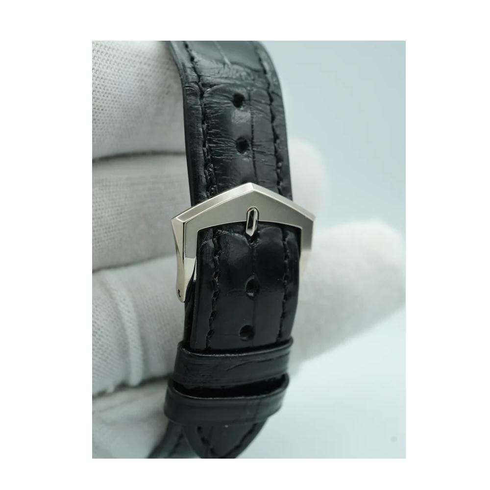 The Patek Philippe 6119G-001 Calatrava embodies timeless elegance with its 18K white gold case and refined black dial. Paired with a sleek black leather strap, this 2024 complete set offers both classic style and expert craftsmanship synonymous with Patek Philippe. Its understated design and meticulous finishing make it a distinguished choice for collectors seeking a sophisticated dress watch.